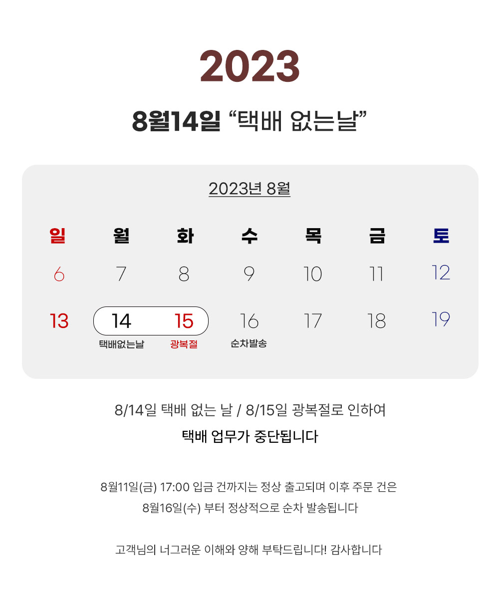 2023년 8월14일(월) 택배없는날(전국 / 전 택배사 공통)로 인한 배송 휴무 일정에 대해 안내드립니다