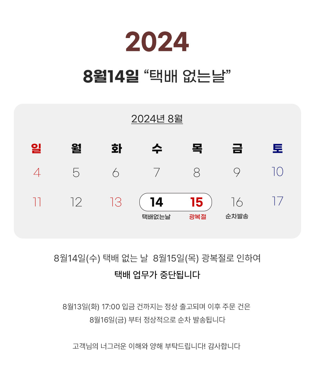 2024년 8월14일(수) 택배없는날(전국 / 전 택배사 공통)로 인한 배송 휴무 일정에 대해 안내드립니다